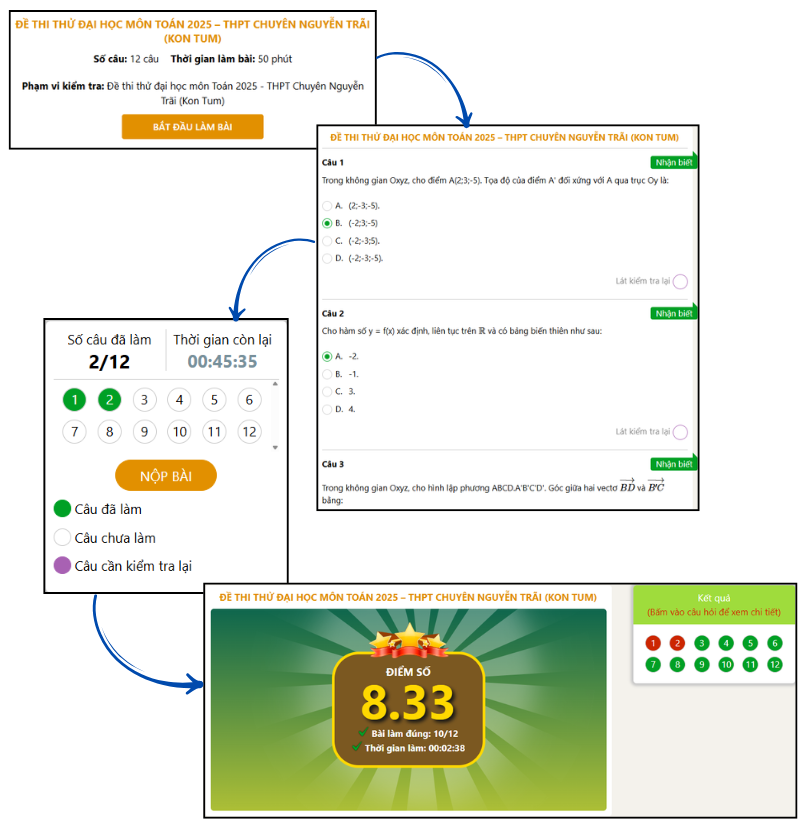 ✅ Chấm điểm tức thì – Kết quả hiển thị ngay sau khi nộp bài, có đáp án đúng sai kèm phân tích chi tiết.